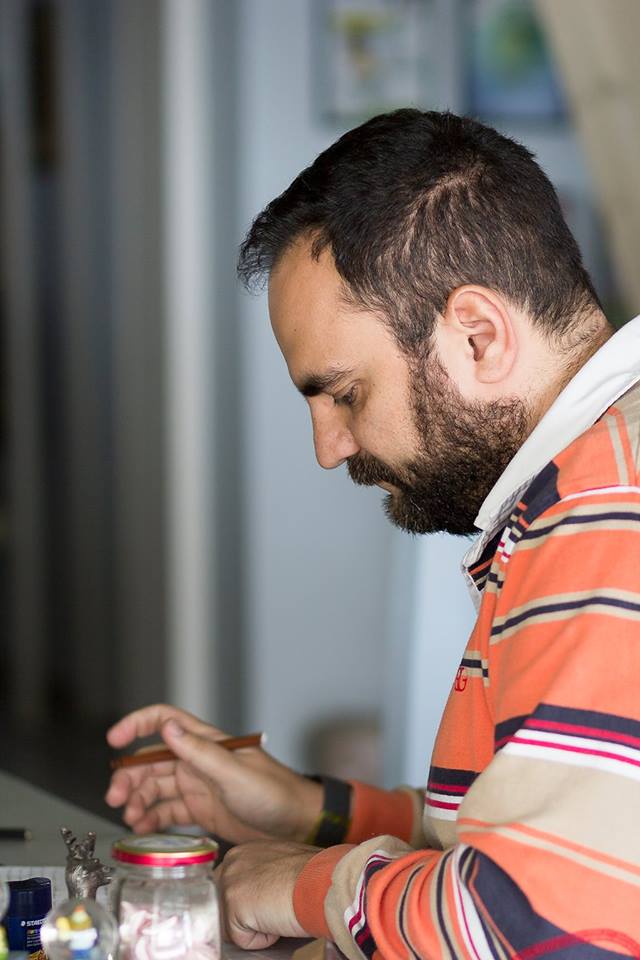 και με φροντίδα διορθώνει με τα χέρια του την κάθε λεπτομέρεια ,