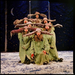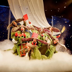 Πλοία που ταξιδεύουν σε θάλασσες από εκτυφλωτική ομίχλη, γιγάντιοι ιστοί αράχνης τυλίγουν το θέατρο – και με τη βοήθεια του κοινού, ομπρέλες στροβιλίζουν στον αέρα καταβρέχοντας, φυσαλίδες αιωρούνται, κλόουν ίπτανται κυνηγώντας τες, σκούπες σκουπίζουν μόνες τους, παλτά «ζωντανεύουν» και γίνονται άνθρωποι, μπάλες διογκώνονται πετώντας, ένα «Βόρειο Σέλας» εμφανίζεται σε απόσταση αναπνοής, λαμπερά φεγγάρια και αστέρια πλαισιώνουν έναν απέραντο, νοσταλγικό, νυχτερινό, έναστρο ουρανό!